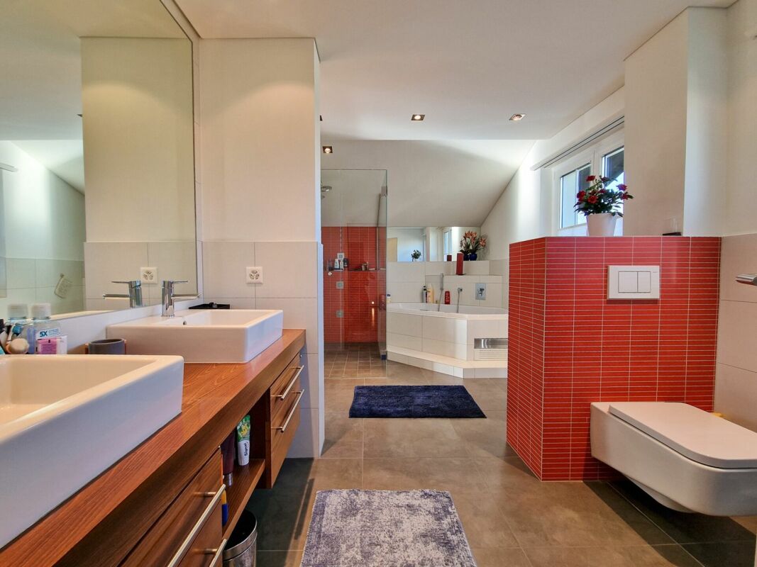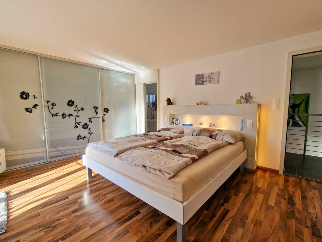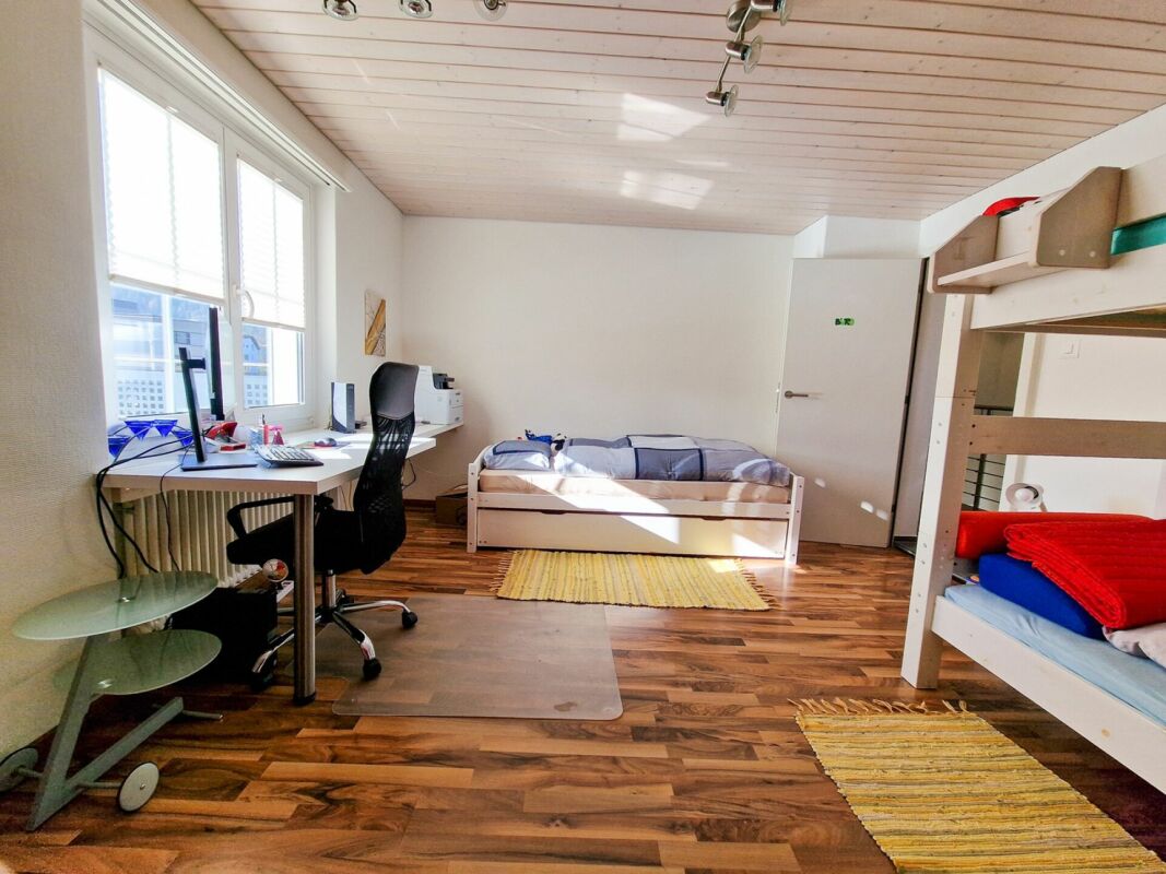 Im Obergeschoss befinden sich das Schlafzimmer mit direkten Balkonzugang, welcher einen herrlichen Ausblick auf die umliegende Berglandschaft beschert. Zwei weitere Zimmer, können ideal als Kinder-, Gäste- oder Arbeitszimmer genutzt werden. Für pure Entspannung im eigenen Zuhause sorgt das Bad mit Eckbadewanne, Dusche, Doppellavabo und WC.