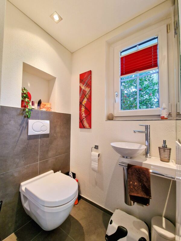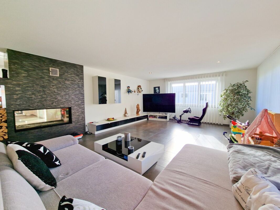 Innen punktet das Haus auf 166 m2 Wohnfläche mit einer attraktiven Raumaufteilung, lichtdurchfluteten Räumen und erstklassiger Wohnqualität. Ein Highlight ist der grosszügige Wintergarten. Die Wohnraumerweiterung lässt keine Wünsche offen und garantiert viele Sonnenstunden zu jeder Jahreszeit. Speziell zu erwähnen ist das stilvolle Cheminée, welches den Wohn- und Essbereich exklusiv unterteilt. Die Küche ist praktisch und funktionell eingerichtet. Eine Gästetoilette rundet das Raumangebot im Erdgeschoss ab.